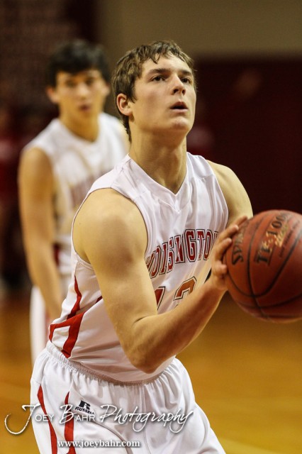 Hoisington Cardinal Steffan Dolechek (#12) shoots a free throw during the Pratt Greenbacks at Hoisington Cardinals Boys Basketball game with Pratt winning 66 to 34 at Hoisington Activity Center in Hoisington, Kansas on January 6, 2015. (Photo: Joey Bahr, www.joeybahr.com)