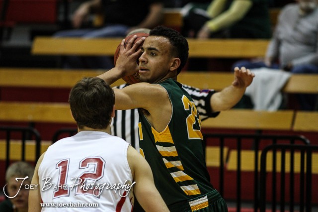 Pratt Greenback Brett Barnard (#23) looks for someone to pass the ball to during the Pratt Greenbacks at Hoisington Cardinals Boys Basketball game with Pratt winning 66 to 34 at Hoisington Activity Center in Hoisington, Kansas on January 6, 2015. (Photo: Joey Bahr, www.joeybahr.com)