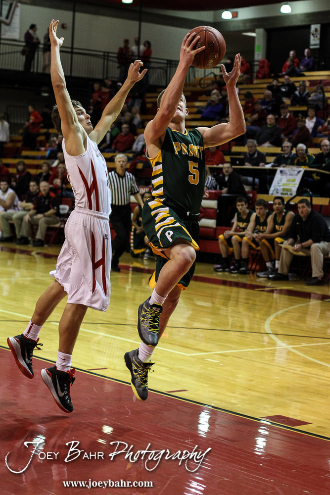 Pratt Greenback Derek Barnard (#5) goes up for a layup during the Pratt Greenbacks at Hoisington Cardinals Boys Basketball game with Pratt winning 66 to 34 at Hoisington Activity Center in Hoisington, Kansas on January 6, 2015. (Photo: Joey Bahr, www.joeybahr.com)