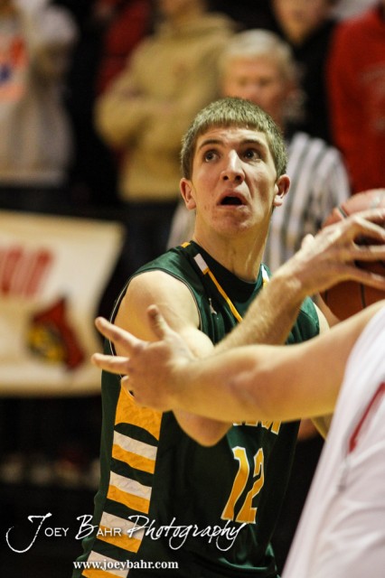 Pratt Greenback Brandon Ruckle (#12) looks to take a shot during the Pratt Greenbacks at Hoisington Cardinals Boys Basketball game with Pratt winning 66 to 34 at Hoisington Activity Center in Hoisington, Kansas on January 6, 2015. (Photo: Joey Bahr, www.joeybahr.com)