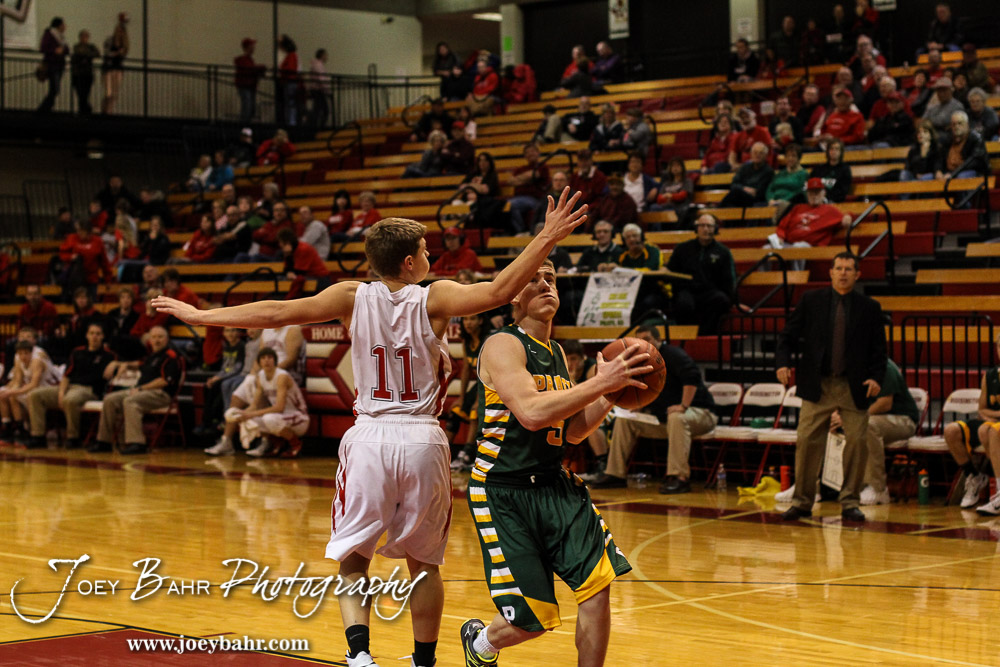 Hoisington Cardinal Tyler Specht (#11) tries to stop Pratt Greenback Derek Barnard (#5) as he drives to the basket during the Pratt Greenbacks at Hoisington Cardinals Boys Basketball game with Pratt winning 66 to 34 at Hoisington Activity Center in Hoisington, Kansas on January 6, 2015. (Photo: Joey Bahr, www.joeybahr.com)