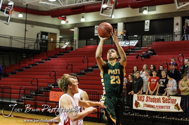Pratt Greenback Brett Barnard (#23) takes a jump shot during the Pratt Greenbacks at Hoisington Cardinals Boys Basketball game with Pratt winning 66 to 34 at Hoisington Activity Center in Hoisington, Kansas on January 6, 2015. (Photo: Joey Bahr, www.joeybahr.com)