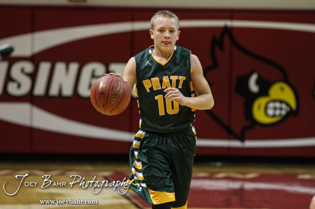 Pratt Greenback Noah Myers (#10) dribbles the ball down the court during the Pratt Greenbacks at Hoisington Cardinals Boys Basketball game with Pratt winning 66 to 34 at Hoisington Activity Center in Hoisington, Kansas on January 6, 2015. (Photo: Joey Bahr, www.joeybahr.com)