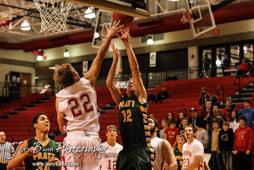 Hoisington Cardinal Grant Dolechek (#22) blocks the shot of Pratt Greenback Brandon Ruckle (#12) during the Pratt Greenbacks at Hoisington Cardinals Boys Basketball game with Pratt winning 66 to 34 at Hoisington Activity Center in Hoisington, Kansas on January 6, 2015. (Photo: Joey Bahr, www.joeybahr.com)