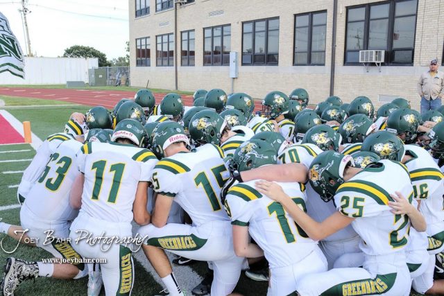 The Pratt Greenbacks huddle prior to running out onto the field before the start of the game. The Pratt Greenbacks defeated the Hoisington Cardinals by a score of 34 to 0 at Elton Brown Field in Hoisington, Kansas on August 31, 2018. (Photo: Joey Bahr, www.joeybahr.com)undefined