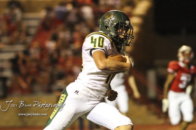 Pratt Greenback #40 Bryce Winsor scores a touchdown in the fourth quarter. The Pratt Greenbacks defeated the Hoisington Cardinals by a score of 34 to 0 at Elton Brown Field in Hoisington, Kansas on August 31, 2018. (Photo: Joey Bahr, www.joeybahr.com)undefined