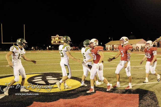 Members of the Pratt Greenbacks and Hoisington Cardinals shake hands following the game. The Pratt Greenbacks defeated the Hoisington Cardinals by a score of 34 to 0 at Elton Brown Field in Hoisington, Kansas on August 31, 2018. (Photo: Joey Bahr, www.joeybahr.com)undefined