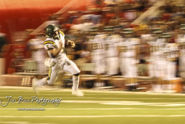 Pratt Greenback #5 Travis Theis runs to the end zone in the third quarter. The Pratt Greenbacks defeated the Hoisington Cardinals by a score of 34 to 0 at Elton Brown Field in Hoisington, Kansas on August 31, 2018. (Photo: Joey Bahr, www.joeybahr.com)undefined