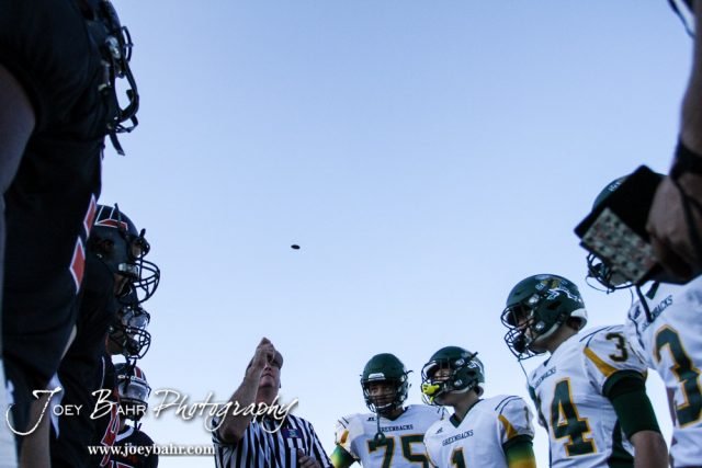 The Head Referee tosses the coin prior to the start of the game. The Pratt Greenbacks win 31 to 16 over the Larned Indians at Earl Roberts Field in Larned, Kansas on September 2, 2016. (Photo: Joey Bahr, www.joeybahr.com)undefined
