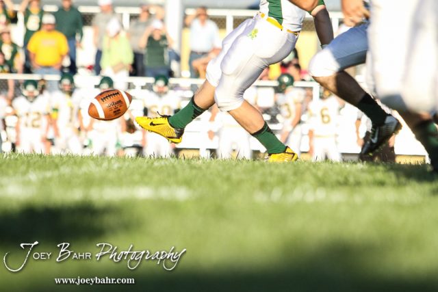 The Pratt Greenbacks kick off the ball to start the game. The Pratt Greenbacks win 31 to 16 over the Larned Indians at Earl Roberts Field in Larned, Kansas on September 2, 2016. (Photo: Joey Bahr, www.joeybahr.com)undefined