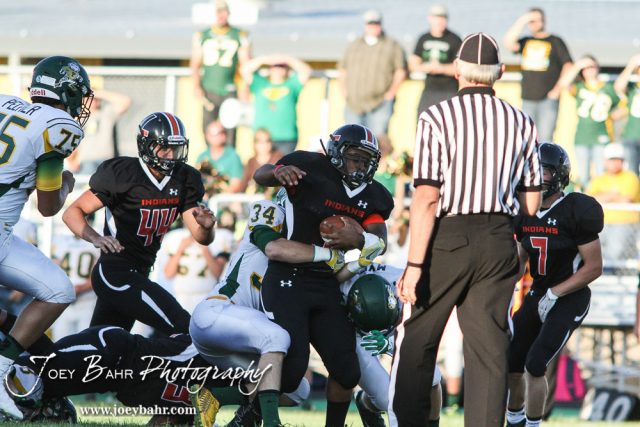 Pratt Greenback Logan Baird (#34) ends Larned Indian Anthony McConnell’s (#1) rush. The Pratt Greenbacks win 31 to 16 over the Larned Indians at Earl Roberts Field in Larned, Kansas on September 2, 2016. (Photo: Joey Bahr, www.joeybahr.com)undefined