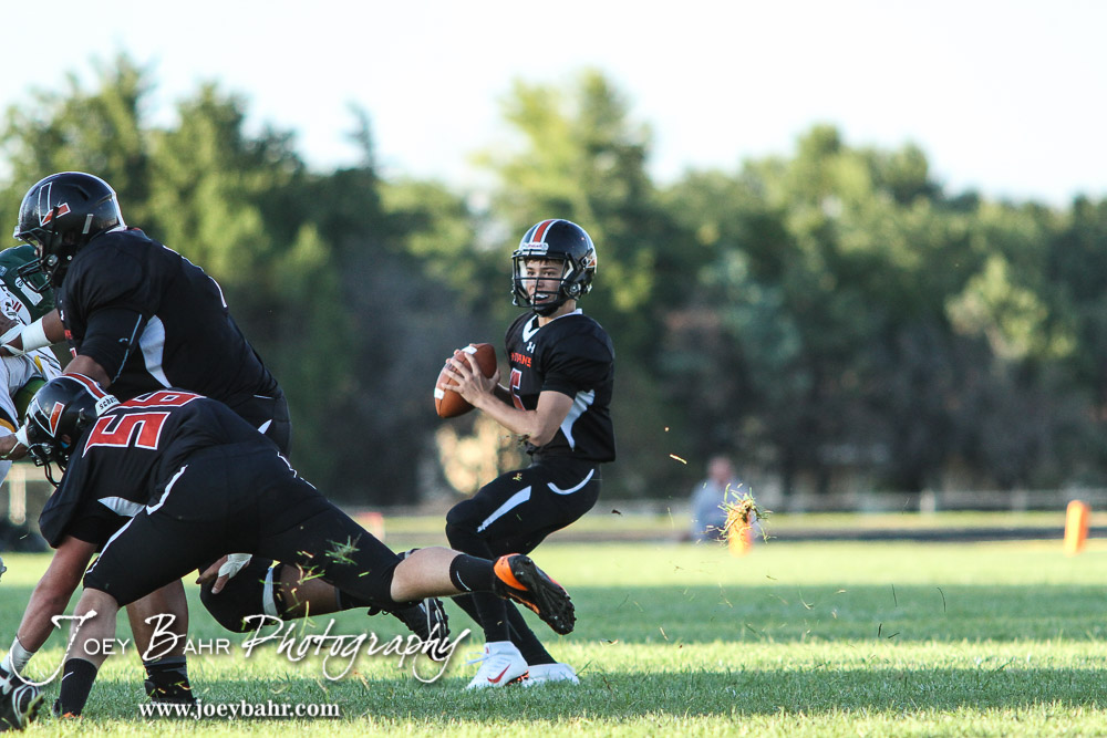 Larned Indian Carson Smith (#5) looks for an open receiver. The Pratt Greenbacks win 31 to 16 over the Larned Indians at Earl Roberts Field in Larned, Kansas on September 2, 2016. (Photo: Joey Bahr, www.joeybahr.com)undefined