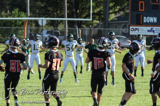 The Pratt Greenbacks and Larned Indians warm up prior to the game. The Pratt Greenbacks win 31 to 16 over the Larned Indians at Earl Roberts Field in Larned, Kansas on September 2, 2016. (Photo: Joey Bahr, www.joeybahr.com)undefined
