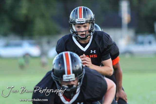 Larned Indian Carson Smith (#5) calls for the ball to be hiked. The Pratt Greenbacks win 31 to 16 over the Larned Indians at Earl Roberts Field in Larned, Kansas on September 2, 2016. (Photo: Joey Bahr, www.joeybahr.com)undefined
