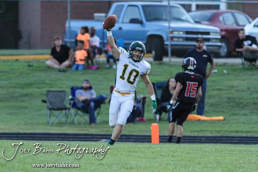 Pratt Greenback Noah Myers (#10) celebrates scoring Pratt’s first touchdown. The Pratt Greenbacks win 31 to 16 over the Larned Indians at Earl Roberts Field in Larned, Kansas on September 2, 2016. (Photo: Joey Bahr, www.joeybahr.com)undefined