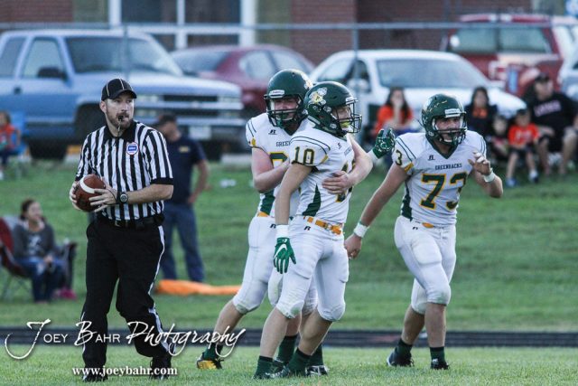 The Pratt Greenbacks celebrate scoring a touchdown. The Pratt Greenbacks win 31 to 16 over the Larned Indians at Earl Roberts Field in Larned, Kansas on September 2, 2016. (Photo: Joey Bahr, www.joeybahr.com)undefined