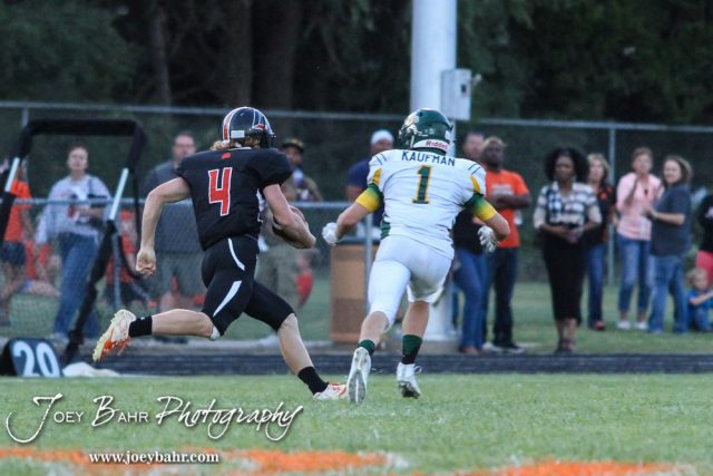 Larned Indian Kolby Keith (#4) dashes towards the end zone as Pratt Greenback Hunter Kaufman (#1) pursues. The Pratt Greenbacks win 31 to 16 over the Larned Indians at Earl Roberts Field in Larned, Kansas on September 2, 2016. (Photo: Joey Bahr, www.joeybahr.com)undefined