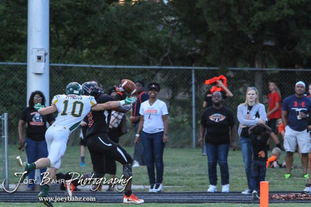 Pratt Greenback Noah Myers (#10) breaks up a pass to Larned Indian Damontay Phillips (#3). The Pratt Greenbacks win 31 to 16 over the Larned Indians at Earl Roberts Field in Larned, Kansas on September 2, 2016. (Photo: Joey Bahr, www.joeybahr.com)undefined