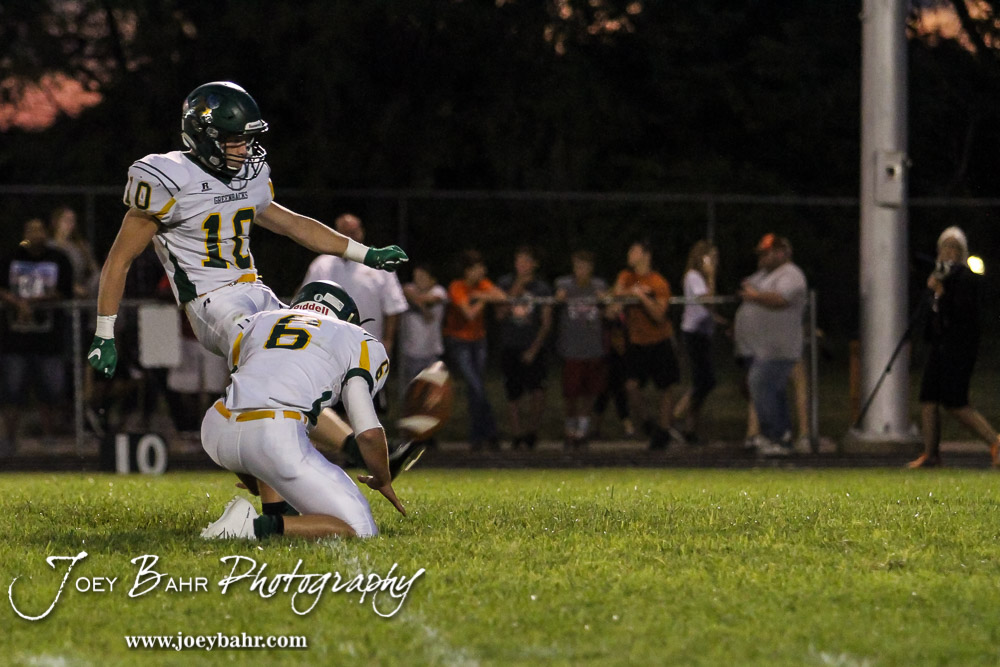 Pratt Greenback Noah Myers (#10) kicks a Point After Touchdown as Landen Studer (#6) holds. The Pratt Greenbacks win 31 to 16 over the Larned Indians at Earl Roberts Field in Larned, Kansas on September 2, 2016. (Photo: Joey Bahr, www.joeybahr.com)undefined