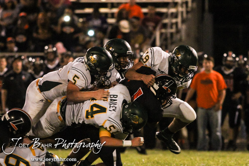 A large group of Pratt Greenbacks swallow up the run of Larned Indian Anthony McConnell (#1). The Pratt Greenbacks win 31 to 16 over the Larned Indians at Earl Roberts Field in Larned, Kansas on September 2, 2016. (Photo: Joey Bahr, www.joeybahr.com)undefined