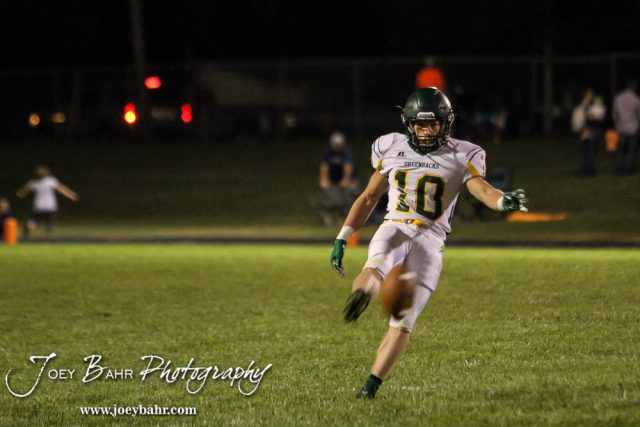 Pratt Greenback Noah Myers (#10) punts the ball away. The Pratt Greenbacks win 31 to 16 over the Larned Indians at Earl Roberts Field in Larned, Kansas on September 2, 2016. (Photo: Joey Bahr, www.joeybahr.com)undefined