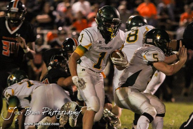 Pratt Greenback Hunter Kaufman (#1) carries the ball. The Pratt Greenbacks win 31 to 16 over the Larned Indians at Earl Roberts Field in Larned, Kansas on September 2, 2016. (Photo: Joey Bahr, www.joeybahr.com)undefined