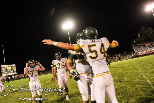 Pratt Greenback Jackson Bailey (#54) celebrates with his teammates after the end of the game. The Pratt Greenbacks win 31 to 16 over the Larned Indians at Earl Roberts Field in Larned, Kansas on September 2, 2016. (Photo: Joey Bahr, www.joeybahr.com)undefined