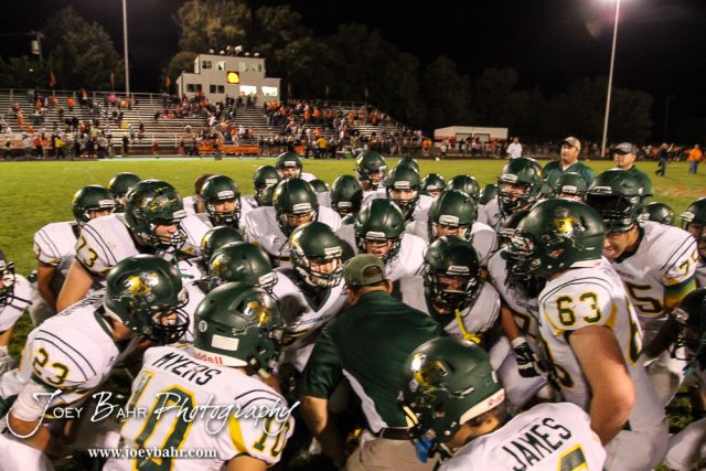 Pratt Greenback Head Coach Jamie Cruce breaks down his team after the game. The Pratt Greenbacks win 31 to 16 over the Larned Indians at Earl Roberts Field in Larned, Kansas on September 2, 2016. (Photo: Joey Bahr, www.joeybahr.com)undefined
