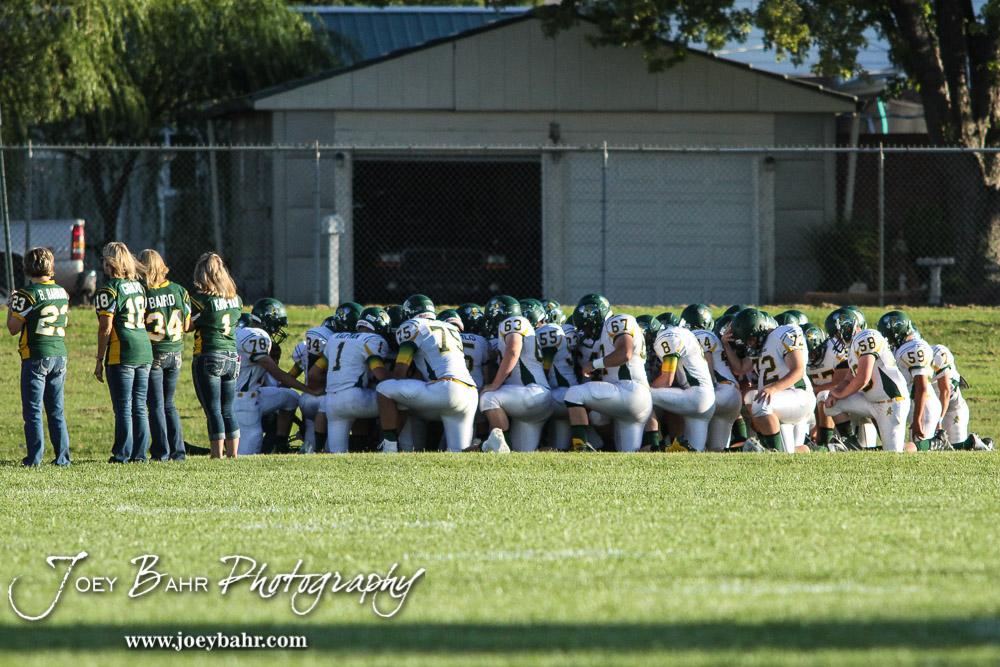 The Pratt Greenbacks kneel in the end zone and pray prior to the game. The Pratt Greenbacks win 31 to 16 over the Larned Indians at Earl Roberts Field in Larned, Kansas on September 2, 2016. (Photo: Joey Bahr, www.joeybahr.com)undefined