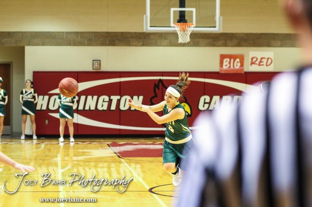 Pratt Lady Greenback Brooklynn Bourgeois (#4) passes the ball during the Pratt Lady Greenbacks at Hoisington Lady Cardinals Girls Basketball game with Pratt winning 34 to 23 at Hoisington Activity Center in Hoisington, Kansas on January 6, 2015. (Photo: Joey Bahr, www.joeybahr.com)