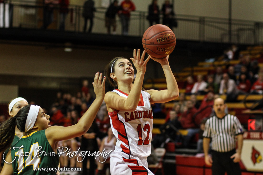Hoisington Lady Cardinal Rylie Koester (#12) goes up for a layup during the Pratt Lady Greenbacks at Hoisington Lady Cardinals Girls Basketball game with Pratt winning 34 to 23 at Hoisington Activity Center in Hoisington, Kansas on January 6, 2015. (Photo: Joey Bahr, www.joeybahr.com)