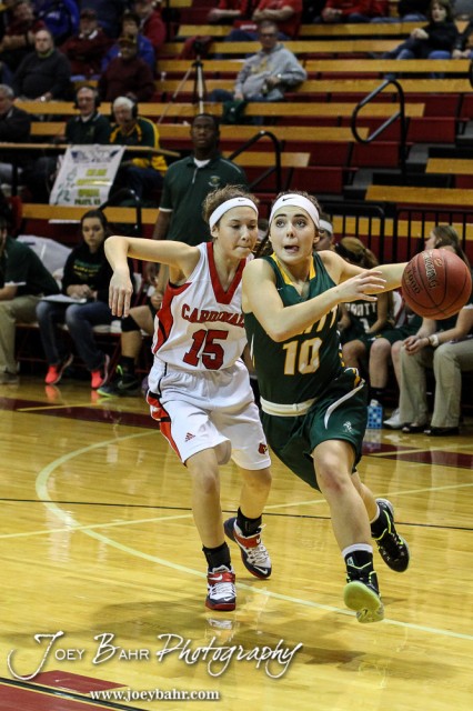 Pratt Lady Greenback Breann Becker (#10) drives to the basket during the Pratt Lady Greenbacks at Hoisington Lady Cardinals Girls Basketball game with Pratt winning 34 to 23 at Hoisington Activity Center in Hoisington, Kansas on January 6, 2015. (Photo: Joey Bahr, www.joeybahr.com)