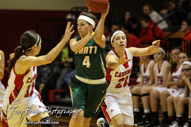 Pratt Lady Greenback Brooklynn Bourgeois (#4) passes the ball during the Pratt Lady Greenbacks at Hoisington Lady Cardinals Girls Basketball game with Pratt winning 34 to 23 at Hoisington Activity Center in Hoisington, Kansas on January 6, 2015. (Photo: Joey Bahr, www.joeybahr.com)