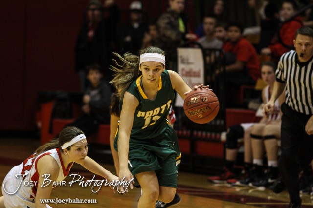Pratt Lady Greenback Kelsey Smith-Potter (#12) dribbles down the court during the Pratt Lady Greenbacks at Hoisington Lady Cardinals Girls Basketball game with Pratt winning 34 to 23 at Hoisington Activity Center in Hoisington, Kansas on January 6, 2015. (Photo: Joey Bahr, www.joeybahr.com)