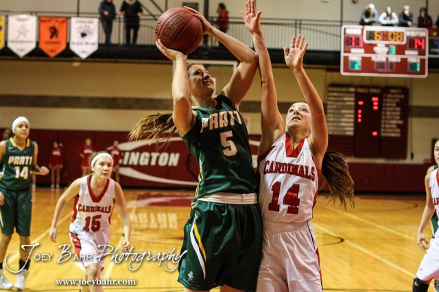 Pratt Lady Greenback Destani Garten (#5) goes up for a layup as Hoisington Lady Cardinal Abbi Demel (#14) defends during the Pratt Lady Greenbacks at Hoisington Lady Cardinals Girls Basketball game with Pratt winning 34 to 23 at Hoisington Activity Center in Hoisington, Kansas on January 6, 2015. (Photo: Joey Bahr, www.joeybahr.com)