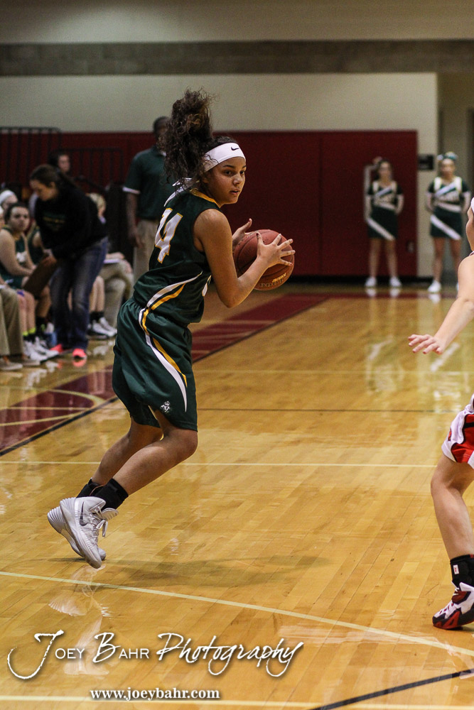 Pratt Lady Greenback Stonie Flemming (#14) looks for someone to pass to during the Pratt Lady Greenbacks at Hoisington Lady Cardinals Girls Basketball game with Pratt winning 34 to 23 at Hoisington Activity Center in Hoisington, Kansas on January 6, 2015. (Photo: Joey Bahr, www.joeybahr.com)