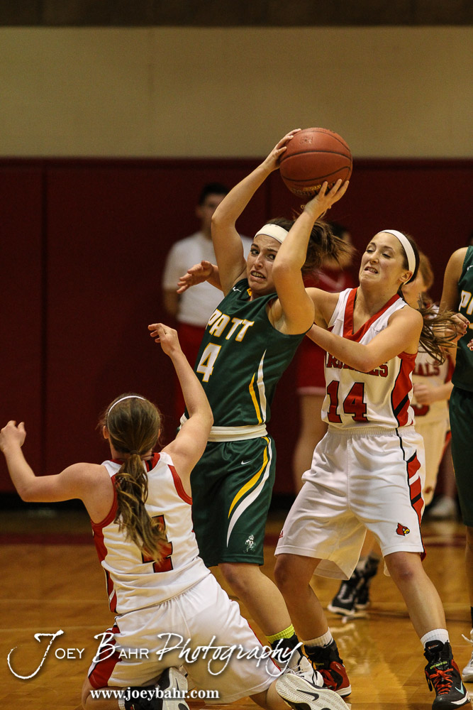 Pratt Lady Greenback Brooklynn Bourgeois (#4) pulls away a loose ball from Hoisington Lady Cardinal Karisa Schremmer (#4) during the Pratt Lady Greenbacks at Hoisington Lady Cardinals Girls Basketball game with Pratt winning 34 to 23 at Hoisington Activity Center in Hoisington, Kansas on January 6, 2015. (Photo: Joey Bahr, www.joeybahr.com)
