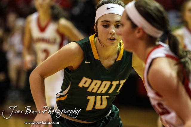 Pratt Lady Greenback Breann Becker (#10) watches the ball during the Pratt Lady Greenbacks at Hoisington Lady Cardinals Girls Basketball game with Pratt winning 34 to 23 at Hoisington Activity Center in Hoisington, Kansas on January 6, 2015. (Photo: Joey Bahr, www.joeybahr.com)