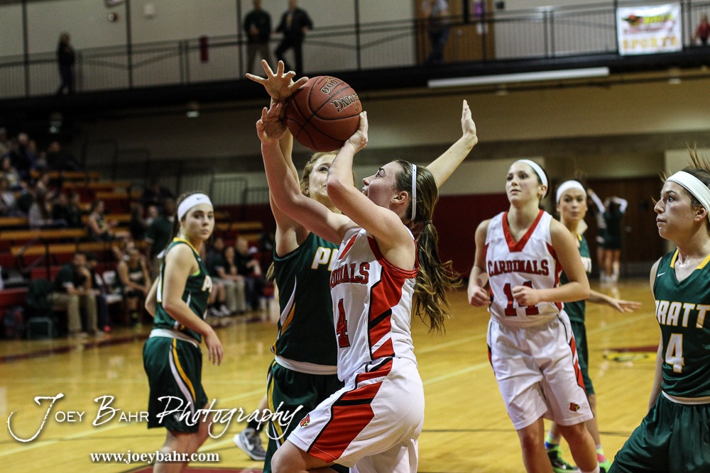 Hoisington Lady Cardinal Karisa Schremmer (#4) goes up for a layup during the Pratt Lady Greenbacks at Hoisington Lady Cardinals Girls Basketball game with Pratt winning 34 to 23 at Hoisington Activity Center in Hoisington, Kansas on January 6, 2015. (Photo: Joey Bahr, www.joeybahr.com)