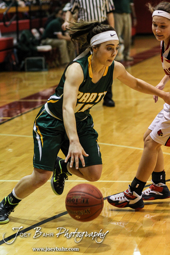 Pratt Lady Greenback Breann Becker (#10) drives towards the lane during the Pratt Lady Greenbacks at Hoisington Lady Cardinals Girls Basketball game with Pratt winning 34 to 23 at Hoisington Activity Center in Hoisington, Kansas on January 6, 2015. (Photo: Joey Bahr, www.joeybahr.com)