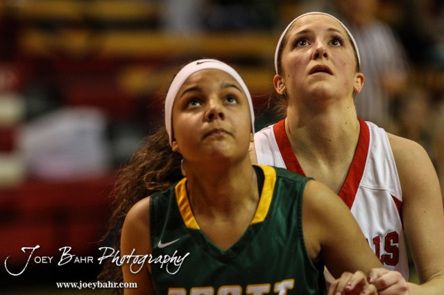 Hoisington Lady Cardinal Abbi Demel (#14) watches a free throw as Pratt Lady Greenback Stonie Flemming (#14) blocks out during the Pratt Lady Greenbacks at Hoisington Lady Cardinals Girls Basketball game with Pratt winning 34 to 23 at Hoisington Activity Center in Hoisington, Kansas on January 6, 2015. (Photo: Joey Bahr, www.joeybahr.com)