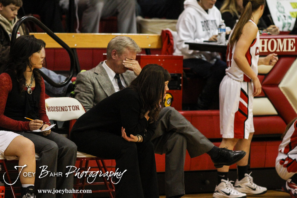 The Hoisington Lady Cardinal coaching staff reacts to a play during the Pratt Lady Greenbacks at Hoisington Lady Cardinals Girls Basketball game with Pratt winning 34 to 23 at Hoisington Activity Center in Hoisington, Kansas on January 6, 2015. (Photo: Joey Bahr, www.joeybahr.com)