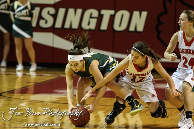 Pratt Lady Greenback Breann Becker (#10) and Hoisington Lady Cardinal Rylie Koester (#12) scramble for a loose ball during the Pratt Lady Greenbacks at Hoisington Lady Cardinals Girls Basketball game with Pratt winning 34 to 23 at Hoisington Activity Center in Hoisington, Kansas on January 6, 2015. (Photo: Joey Bahr, www.joeybahr.com)
