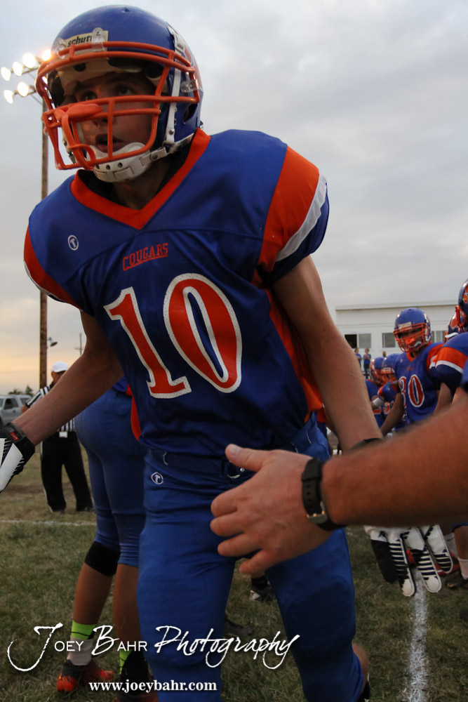 Otis-Bison Cougar Colin Regan (#10) runs out for a player introduction before the Pratt-Skyline at Otis-Bison High School Football game with Pratt-Skyline winning 44 to 38 in Overtime at Otis-Bison High School in Otis, Kansas on September 27, 2013. (Photo: Joey Bahr, www.joeybahr.com)