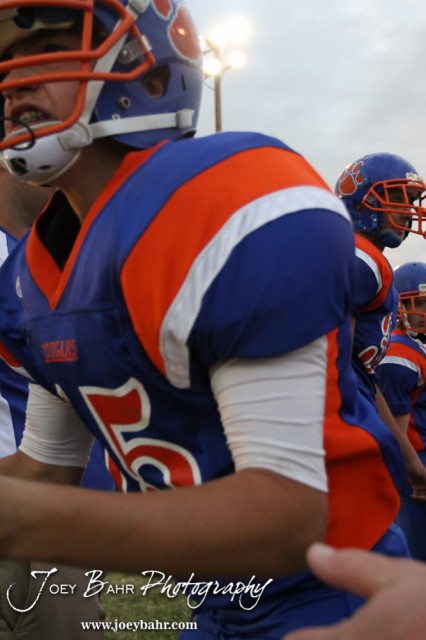 Otis-Bison Cougar Kade Urban (#15) runs out for a player introduction before the Pratt-Skyline at Otis-Bison High School Football game with Pratt-Skyline winning 44 to 38 in Overtime at Otis-Bison High School in Otis, Kansas on September 27, 2013. (Photo: Joey Bahr, www.joeybahr.com)