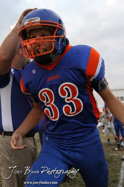 Otis-Bison Cougar Jordan Hoffman (#33) runs out for a player introduction before the Pratt-Skyline at Otis-Bison High School Football game with Pratt-Skyline winning 44 to 38 in Overtime at Otis-Bison High School in Otis, Kansas on September 27, 2013. (Photo: Joey Bahr, www.joeybahr.com)