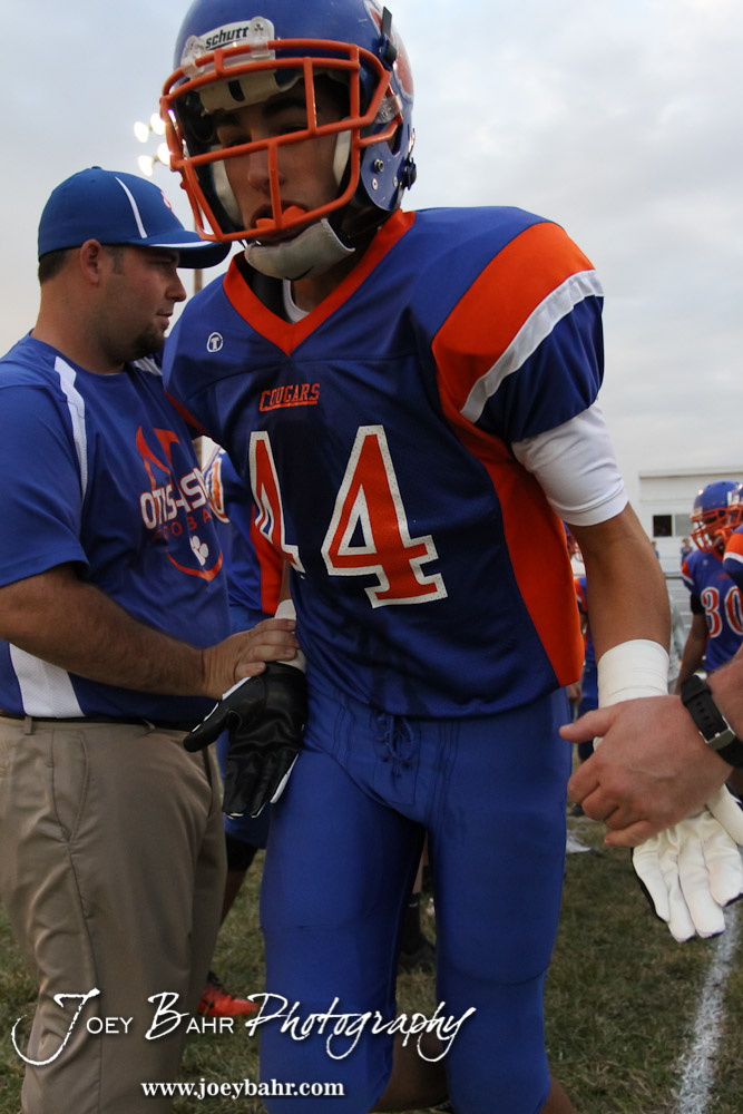 Otis-Bison Cougar Hayden Maier (#44) runs out for a player introduction before the Pratt-Skyline at Otis-Bison High School Football game with Pratt-Skyline winning 44 to 38 in Overtime at Otis-Bison High School in Otis, Kansas on September 27, 2013. (Photo: Joey Bahr, www.joeybahr.com)