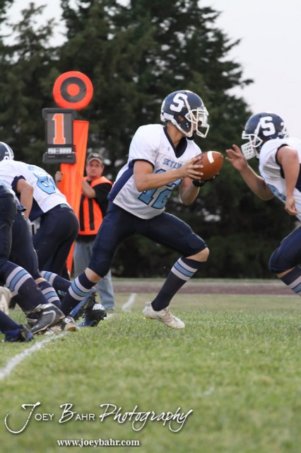 Skyline Thunderbird Cole Patterson (#12) hands off the ball during the Pratt-Skyline at Otis-Bison High School Football game with Pratt-Skyline winning 44 to 38 in Overtime at Otis-Bison High School in Otis, Kansas on September 27, 2013. (Photo: Joey Bahr, www.joeybahr.com)
