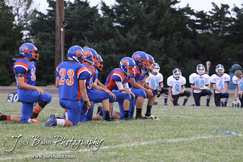 The Otis-Bison Cougars take a knee as their teammate is tended to during the Pratt-Skyline at Otis-Bison High School Football game with Pratt-Skyline winning 44 to 38 in Overtime at Otis-Bison High School in Otis, Kansas on September 27, 2013. (Photo: Joey Bahr, www.joeybahr.com)