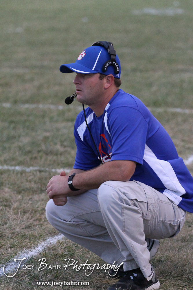 Otis-Bison Cougar Head Coach Travis Starr watches a play during the Pratt-Skyline at Otis-Bison High School Football game with Pratt-Skyline winning 44 to 38 in Overtime at Otis-Bison High School in Otis, Kansas on September 27, 2013. (Photo: Joey Bahr, www.joeybahr.com)